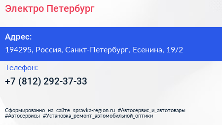 Электро-Петербург по адресу 194295, Россия, Санкт-Петербург, Есенина, 19/2 в дальнейшем Организация, размещена в следующих категориях: