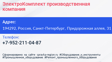 ЭлектроКомплект, производственная компания по адресу 194292, Россия, Санкт-Петербург, Придорожная аллея, 31 в дальнейшем Организация, размещена в следующих категориях: