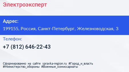 Электроэксперт по адресу 199155, Россия, Санкт-Петербург, Железноводская, 3 в дальнейшем Организация, размещена в следующих категориях: