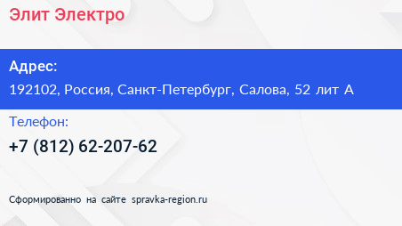 Элит-Электро по адресу 192102, Россия, Санкт-Петербург, Салова, 52 лит А в дальнейшем Организация, размещена в следующих категориях: