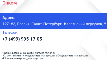 Энком по адресу 197183, Россия, Санкт-Петербург, Карельский переулок, 9 в дальнейшем Организация, размещена в следующих категориях: