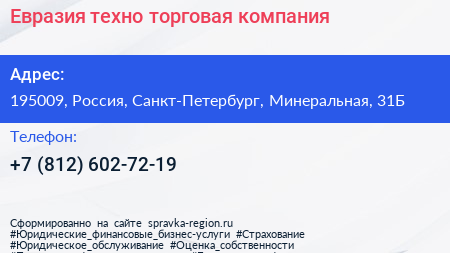 Евразия, техно-торговая компания по адресу 195009, Россия, Санкт-Петербург, Минеральная, 31Б в дальнейшем Организация, размещена в следующих категориях: