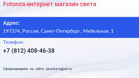 Fotonza, интернет-магазин света по адресу 197374, Россия, Санкт-Петербург, Мебельная, 1 в дальнейшем Организация, размещена в следующих категориях: