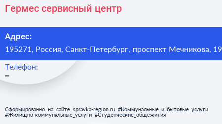 Гермес, сервисный центр по адресу 195271, Россия, Санкт-Петербург, проспект Мечникова, 19 в дальнейшем Организация, размещена в следующих категориях: