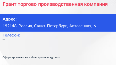 Грант, торгово-производственная компания по адресу 192148, Россия, Санкт-Петербург, Автогенная, 6 в дальнейшем Организация, размещена в следующих категориях:
