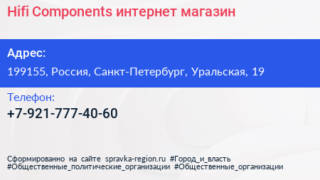 Hifi Components, интернет-магазин по адресу 199155, Россия, Санкт-Петербург, Уральская, 19 в дальнейшем Организация, размещена в следующих категориях: