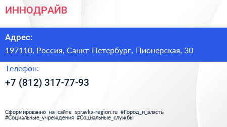 ИННОДРАЙВ по адресу 197110, Россия, Санкт-Петербург, Пионерская, 30 в дальнейшем Организация, размещена в следующих категориях: