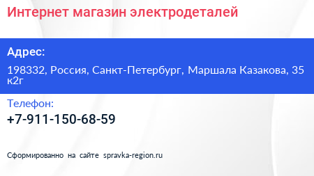 Интернет-магазин электродеталей по адресу 198332, Россия, Санкт-Петербург, Маршала Казакова, 35 к2г в дальнейшем Организация, размещена в следующих категориях: