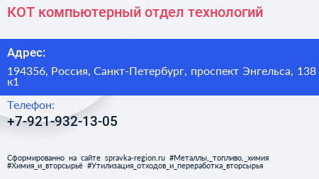 КОТ, компьютерный отдел технологий по адресу 194356, Россия, Санкт-Петербург, проспект Энгельса, 138 к1 в дальнейшем Организация, размещена в следующих категориях: