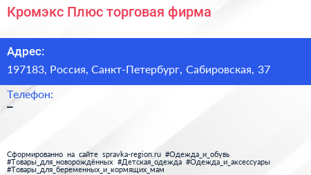 Кромэкс Плюс, торговая фирма по адресу 197183, Россия, Санкт-Петербург, Сабировская, 37 в дальнейшем Организация, размещена в следующих категориях: