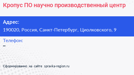 Кропус-ПО, научно-производственный центр по адресу 190020, Россия, Санкт-Петербург, Циолковского, 9 в дальнейшем Организация, размещена в следующих категориях: