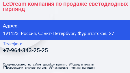 LeDream, компания по продаже светодиодных гирлянд по адресу 191123, Россия, Санкт-Петербург, Фурштатская, 27 в дальнейшем Организация, размещена в следующих категориях: