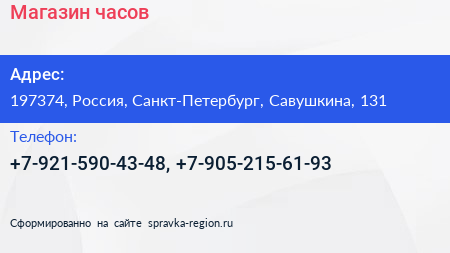 Магазин часов по адресу 197374, Россия, Санкт-Петербург, Савушкина, 131 в дальнейшем Организация, размещена в следующих категориях: