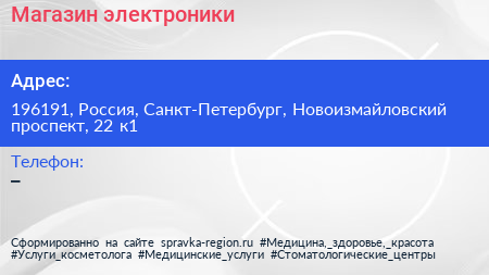 Магазин электроники по адресу 196191, Россия, Санкт-Петербург, Новоизмайловский проспект, 22 к1 в дальнейшем Организация, размещена в следующих категориях: