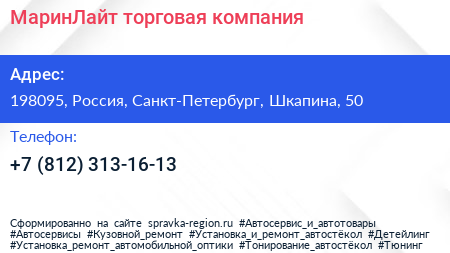 МаринЛайт, торговая компания по адресу 198095, Россия, Санкт-Петербург, Шкапина, 50 в дальнейшем Организация, размещена в следующих категориях: