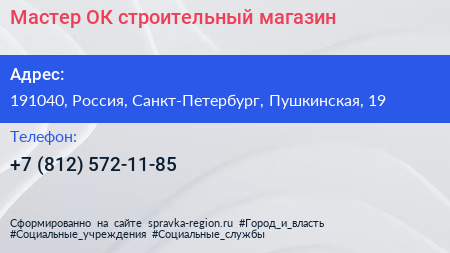 Мастер ОК!, строительный магазин по адресу 191040, Россия, Санкт-Петербург, Пушкинская, 19 в дальнейшем Организация, размещена в следующих категориях: