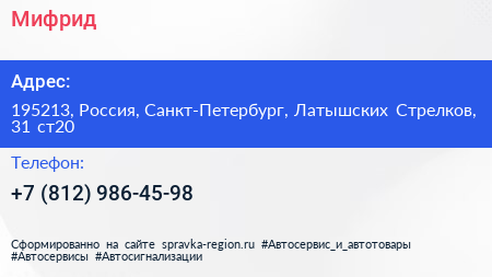 Мифрид по адресу 195213, Россия, Санкт-Петербург, Латышских Стрелков, 31 ст20 в дальнейшем Организация, размещена в следующих категориях: