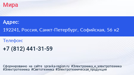 Мира по адресу 192241, Россия, Санкт-Петербург, Софийская, 56 к2 в дальнейшем Организация, размещена в следующих категориях:
