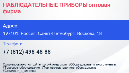 НАБЛЮДАТЕЛЬНЫЕ ПРИБОРЫ, оптовая фирма по адресу 197101, Россия, Санкт-Петербург, Воскова, 18 в дальнейшем Организация, размещена в следующих категориях: