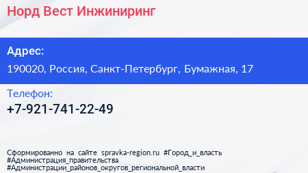 Норд-Вест Инжиниринг по адресу 190020, Россия, Санкт-Петербург, Бумажная, 17 в дальнейшем Организация, размещена в следующих категориях: