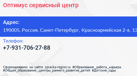 Оптимус, сервисный центр по адресу 190005, Россия, Санкт-Петербург, Красноармейская 2-я, 13 в дальнейшем Организация, размещена в следующих категориях: