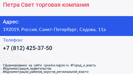 Петра-Свет, торговая компания по адресу 192019, Россия, Санкт-Петербург, Седова, 11а в дальнейшем Организация, размещена в следующих категориях: