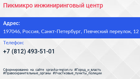 Пикмикро, инжиниринговый центр по адресу 197046, Россия, Санкт-Петербург, Певческий переулок, 12 в дальнейшем Организация, размещена в следующих категориях: