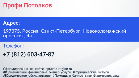 Профи-Потолков по адресу 197375, Россия, Санкт-Петербург, Новоколомяжский проспект, 4а в дальнейшем Организация, размещена в следующих категориях: