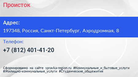 Происток по адресу 197348, Россия, Санкт-Петербург, Аэродромная, 8 в дальнейшем Организация, размещена в следующих категориях: