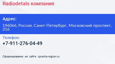 Radiodetals, компания по адресу 196066, Россия, Санкт-Петербург, Московский проспект, 216 в дальнейшем Организация, размещена в следующих категориях: