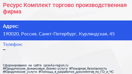 Ресурс Комплект, торгово-производственная фирма по адресу 190020, Россия, Санкт-Петербург, Курляндская, 45 в дальнейшем Организация, размещена в следующих категориях: