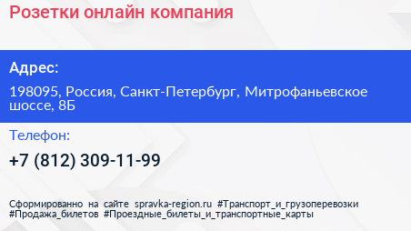 Розетки-онлайн, компания по адресу 198095, Россия, Санкт-Петербург, Митрофаньевское шоссе, 8Б в дальнейшем Организация, размещена в следующих категориях: