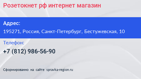 Розетокнет.рф, интернет-магазин по адресу 195271, Россия, Санкт-Петербург, Бестужевская, 10 в дальнейшем Организация, размещена в следующих категориях: