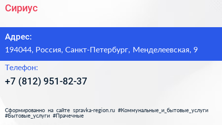 Сириус по адресу 194044, Россия, Санкт-Петербург, Менделеевская, 9 в дальнейшем Организация, размещена в следующих категориях: