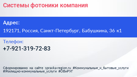 Системы фотоники, компания по адресу 192171, Россия, Санкт-Петербург, Бабушкина, 36 к1 в дальнейшем Организация, размещена в следующих категориях: