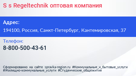 S+s Regeltechnik, оптовая компания по адресу 194100, Россия, Санкт-Петербург, Кантемировская, 37 в дальнейшем Организация, размещена в следующих категориях: