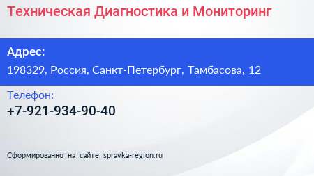 Техническая Диагностика и Мониторинг по адресу 198329, Россия, Санкт-Петербург, Тамбасова, 12 в дальнейшем Организация, размещена в следующих категориях: