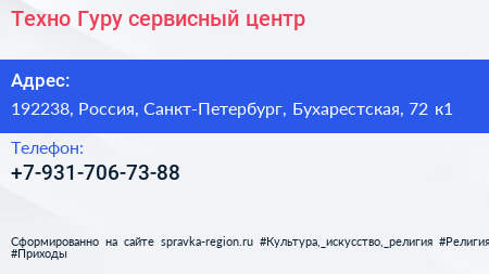 Техно Гуру, сервисный центр по адресу 192238, Россия, Санкт-Петербург, Бухарестская, 72 к1 в дальнейшем Организация, размещена в следующих категориях: