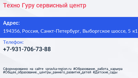 Техно Гуру, сервисный центр по адресу 194356, Россия, Санкт-Петербург, Выборгское шоссе, 5 к1 в дальнейшем Организация, размещена в следующих категориях: