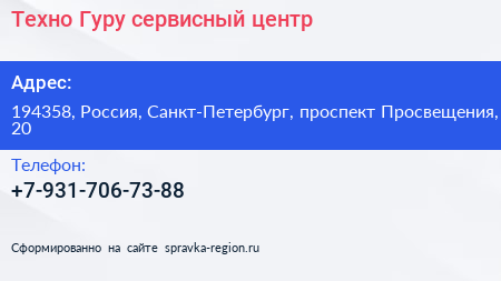 Техно Гуру, сервисный центр по адресу 194358, Россия, Санкт-Петербург, проспект Просвещения, 20 в дальнейшем Организация, размещена в следующих категориях:
