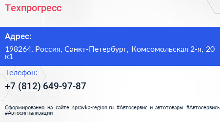 Техпрогресс по адресу 198264, Россия, Санкт-Петербург, Комсомольская 2-я, 20 к1 в дальнейшем Организация, размещена в следующих категориях: