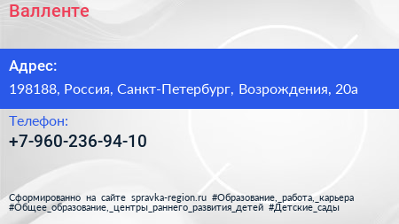 Валленте по адресу 198188, Россия, Санкт-Петербург, Возрождения, 20а в дальнейшем Организация, размещена в следующих категориях: