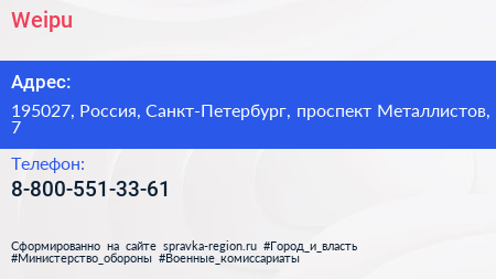 Weipu по адресу 195027, Россия, Санкт-Петербург, проспект Металлистов, 7 в дальнейшем Организация, размещена в следующих категориях: