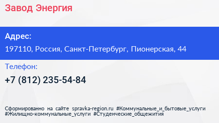 Завод Энергия по адресу 197110, Россия, Санкт-Петербург, Пионерская, 44 в дальнейшем Организация, размещена в следующих категориях: