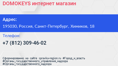 DOMOKEYS, интернет-магазин по адресу 195030, Россия, Санкт-Петербург, Химиков, 18 в дальнейшем Организация, размещена в следующих категориях: