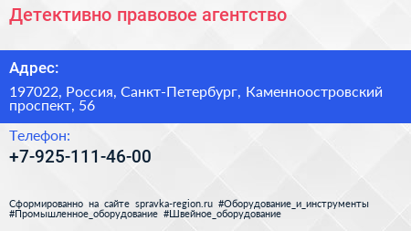 Детективно-правовое агентство по адресу 197022, Россия, Санкт-Петербург, Каменноостровский проспект, 56 в дальнейшем Организация, размещена в следующих категориях:
