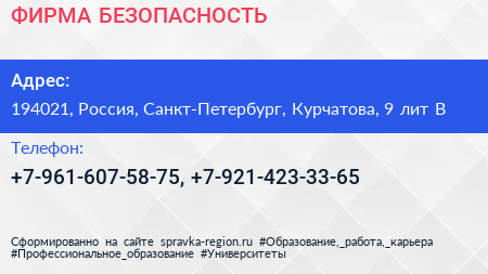 ФИРМА БЕЗОПАСНОСТЬ по адресу 194021, Россия, Санкт-Петербург, Курчатова, 9 лит В в дальнейшем Организация, размещена в следующих категориях: