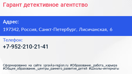 Гарант, детективное агентство по адресу 197342, Россия, Санкт-Петербург, Лисичанская, 6 в дальнейшем Организация, размещена в следующих категориях: