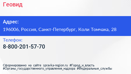 Геовид по адресу 196006, Россия, Санкт-Петербург, Коли Томчака, 28 в дальнейшем Организация, размещена в следующих категориях:
