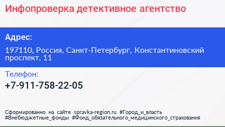 Инфопроверка, детективное агентство по адресу 197110, Россия, Санкт-Петербург, Константиновский проспект, 11 в дальнейшем Организация, размещена в следующих категориях: